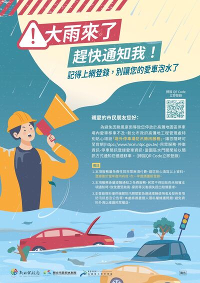 高灘處表示,凡停放在新北堤外停車場之汽、機車,可在高灘處官網(https://gov.tw/mR2) 「堤外停車場防汛簡訊服務」登錄防汛通知,以接獲河濱防汛相關資訊。