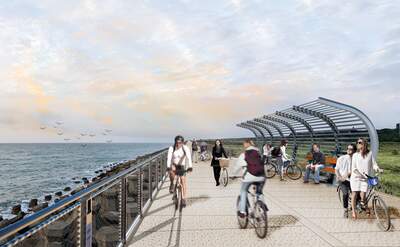 處長黃裕斌補充,海堤段總長約1.7公里,工程主要為拓寬自行車道,規劃以海天一線進行淨寬3公尺之堤頂自行車道建置,以高架鋼構橋落柱於海堤混凝土結構,與無限綿延海景結合,並藉優化既有的自行車道與入口標誌指引,提供更清楚、舒適的通行空間,提升金色水岸自行車道之串接性。新北河濱擁有全台最長河濱自行車道,共有七條自行車道長度218公里串聯北北基桃,是北台灣重要的河濱自行車道交通動脈,淡水金色水岸自行車道優化工程已陸續開工,沿線5段工程預計於116年完工。