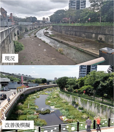 他補充,二期工程考量原有河道寬度足夠,於不妨礙河防安全下,於開闊處營造中島陸域棲地,作為生態跳島方便動物遷移。除此之外,設計階段透過市府流域治理平台的討論,並邀請專家學者協助審查提供指導,包含水位抬高控制、水流方向引導、水質曝氣、丁壩自然淤積、深潭淺瀨營造等。除水域生態之外,陸域則延續前期親水廊道,於河道側增設2公尺懸臂鋼構棧道,並於堅實一橋增設一處無障礙入口連接周圍公園及步道,未來可領銜都市之開發,提升民眾居住品質。以一期工程為例,經過生態環境調查發現生物由378種提升至977種、污染指數由7.24 RPI降至4 RPI,顯見環境營造有成。相信二期工程的生物棲地營造完工後可再吸引動植物前來並提升生物數量,串聯起第二期與第一期之水域完工成果,保持縱向水生動植物的場域完整性。