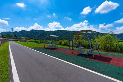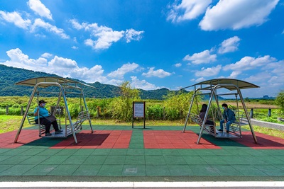 去年市府於山水步道周邊設置1處汽、機停車場,方便民眾前往此處休憩不用擔心車輛停放問題,另一旁的丘陵高處設有觀景涼亭,讓人可以登高體驗大自然的美好。為提供不同的休憩體驗,市府今年於河畔側增設2組休憩搖椅,民眾在搖椅上吹著徐徐微風,依靠著美麗的河岸,悠悠哉哉觀賞山湖景色,彷彿與世隔絕般享受著悠閒自得的愜意人生。