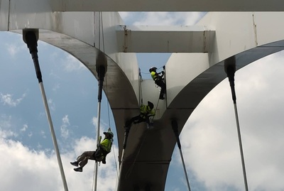 【新北市訊】啟用逾十年的新月橋,是連結新莊與板橋的重要跨河景觀橋,為確保橋梁結構長期穩定與安全,新北市政府高灘地工程管理處已於今年1月完成全橋吊索更新及鋼拱段銲道超音波檢測,並趁初秋天候較為穩定之際,安排具專業證照的高空繩索技術人員(俗稱「蜘蛛人」)進行銲道改善作業。