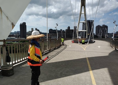 剛好路過的張先生表示,有詢問現場工作人員得知正在辦理新月橋橋拱改善,看到這群專業的工作人員全副武裝攀爬在高空橋上,作業相當嚴謹且專業,心中充滿了由衷的敬意,也為現場辛苦工作人員加油打氣。