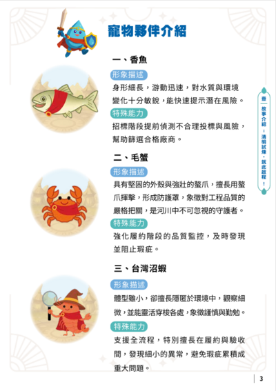 宋德仁說,為了讓嚴肅的工程採購指引能更淺顯易懂,特別以闖關遊戲方式呈現。他指出,水利局透過整治,已讓新北重要的水利整治區域五溝一堰(藤寮坑溝、大窠坑溪、瓦磘溝、鴨母港溝、湳仔溝及碧潭堰)成為生態豐沛的水域,因此由故事中睿智的「水利爺爺」及「水利寶寶」領軍,攜手這些水域中常見的5種物種夥伴,更能展現水利建設兼顧生態環境的成果。