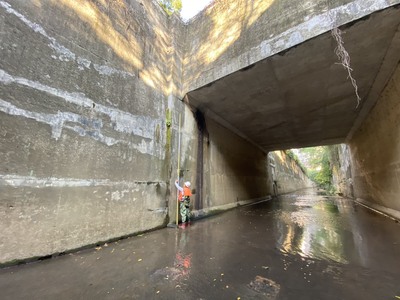 水利局說明,水利建造物的檢查項目涵蓋了各排水系統的基礎及附屬設施,工作團隊常需爬山涉水進行檢查作業,面對各種艱難的環境條件,以目視徒步方式搭配相關科技工具,如無人機(UAV)、透地雷達等,來檢測防洪設施是否出現龜裂或結構異常,進而提前修繕以確保防洪安全。面對全球氣候變遷所帶來的極端降雨,水利局每年都投入大量人力,持續推動水利建造物的檢查與修復工作,以提早發現缺失並即時改善,確保各項水利設施能更有效面對嚴峻的汛期挑戰。