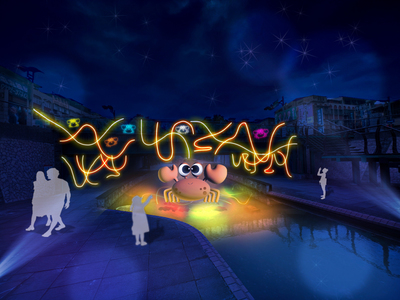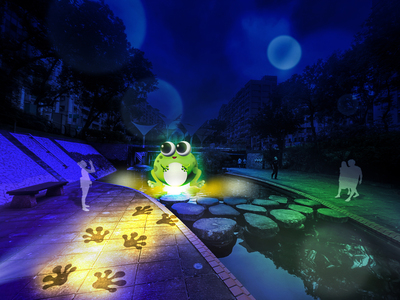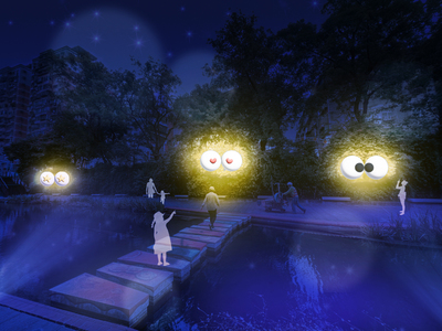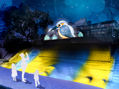 市府水利局表示,為了突破以往一成不變只有夜間光雕展出,這次白天也很有看頭,裝置作品是以氣膜、彈性絨布等材質製作,不只白天來散步的民眾可欣賞及拍照,夜晚結合光影設計,展現日夜都好玩好拍的多元面向。光雕展演設計構想以河川整治後水域生態復育成果作為發想,並以逗趣的大眼睛做為設計理念,將發光眼球藏匿在樹叢中,彷彿樹精靈一般,守護著河川生態。在河域環境改善出現大量毛蟹蹤跡,重現生命搖籃的河川復育力,而乾淨清澈的水域吸引青蛙及蜻蜓在此棲息,舒適的水域環境常有翠鳥佇立於平台上搜索獵物,靜候魚蝦靠近,將此意象運用巨大化的表現手法將可愛生物KUSO化,並以逗趣的大眼睛元素串穿全場。