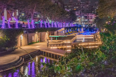 中港大排河廊由自立廣場至凹灣碼頭全長1.8公里行道樹,已披上璀璨閃亮的粉紫色燈飾,透過光的線條、浪漫的色調,讓河廊搖身ㄧ變成為夢幻國度,再加上河廊內俏皮的麋鹿持續賣萌,將陪伴著大家歡樂過年並迎接精彩光雕展到來。