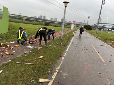 高灘處處長黃裕斌表示,河濱公園雖是熱門休憩點,但人潮帶來的垃圾問題卻日益嚴峻。統計今年農曆春節數據,短短初一至初六期間,全園區清運垃圾量高達177.36公噸,其中爆竹煙火廢棄物就佔了約82.86公噸。當遊客開心遊玩時,清潔人員卻得彎腰低頭,與成堆的垃圾奮戰;大量湧入的廢棄物不僅增加清運難度,更需額外調度壓縮車協助處理。此外,違規燃放爆竹產生的煙屑若掉入草叢,極易引發火災,保全人員除了需頻繁勸離違規民眾,更需隨時待命協助滅火及通報消防單位,疲於奔命。